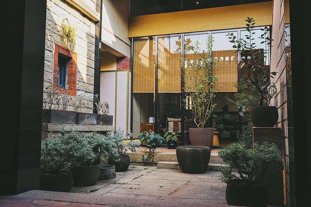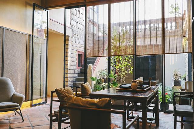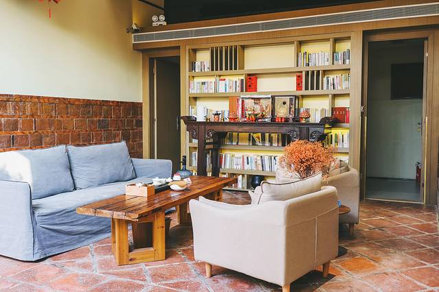 古老的民宿经过设计师的雕磨,在保留了原有格局的情况下,做了现代化的改造。木制大门、石头地基,红砖外墙、红砖地板、木梁柱以及砖制窗花都尽最大的努力保持原汁原味,只利用玻璃和木板等材料做了一些变动。