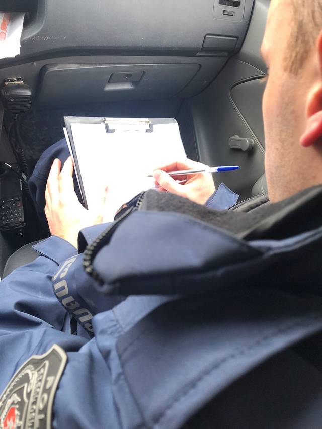 小爸坐在警察的车里,警察慢悠悠的写着事故报告,A4纸,纯手写,写了两张