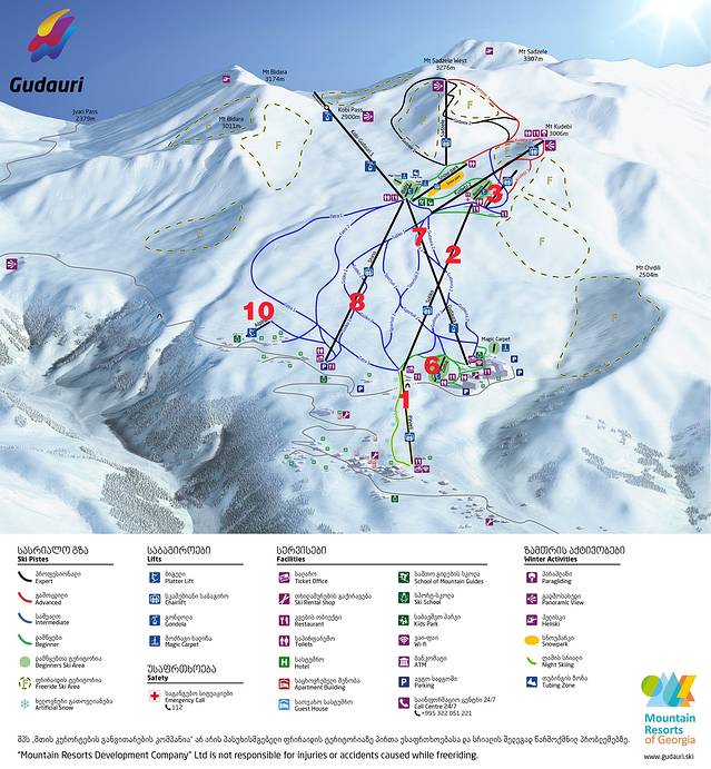 最上面还有三条没有编号的缆车分别是通往2900m高度的Kobi Gudauri1吊厢和3006m高度的Kudebi2吊椅,最高峰3276m的Sadzele吊椅,其中通往最高峰Sadzele的缆车需要到达中段后再坐Snow Park吊椅才能换乘