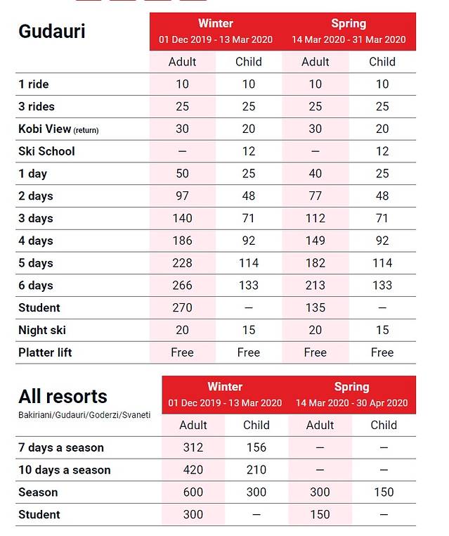 1 Day及多天的雪票,购买时需要多付5拉里的押金,卡是重复使用的,卡面会有可擦拭修改的激光打印日期, 比如 你先买了1 Day的卡,之后你还想再滑2天,只要把卡带去售票处,卡面上会抹去原来的日期,重新打印,走之前如果把雪卡退了,就能拿回5拉里,也可以留作纪念带走