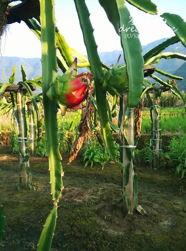 奇的火龙果树,只有晚上开花,乡民说开花的时候非常好看,很大一朵,如昙花一般,早上太阳出来花即凋谢,然后开始结出火龙果来。这里的都是红心火龙果