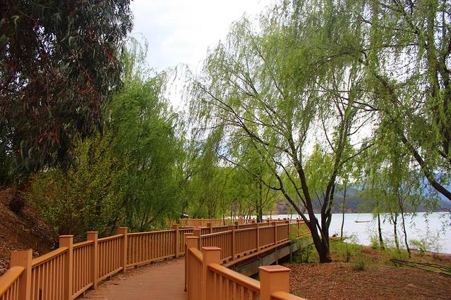 由于我们从成都坐的火车凌晨4点半就到西昌了,下火车出站之后外面很多司机都在吆喝拉客,碰着两个妹子要去邛海那边的,我想着时间早也许可以赶上去邛海看个日出,然后再去汽车站坐车也来得及。于是我们就跟那两个妹子一起拼车去了邛海那边,到了之后天还是黑的,路上都没人,看到路边有个酒店亮着灯,我们就跟保安大叔说进去坐会等天亮。保安大叔人挺好的,让我们坐到了6点多,那两个妹子之后直接去找她们订的酒店了,我们看着天快亮了就拖着行李往邛海边去了。