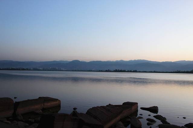 看着天快要亮了,邛海对面的山头越来越泛着霞光,从6点等到7点,日出却就是没有冒出山头。我们只能一边往前走一边看了,眼看都快7点半了还没出来,实在是等不及了,要赶着去汽车站坐泸沽湖的车呀。于是就只有作罢,离开邛海,到马路上打车,最郁闷的是我们才刚离开,坐上出租车的时候,太阳彻底的出来了,就差了那么几分钟时间吧。没关系,心想可以去泸沽湖看更美的日出(后来这个也没能实现,都怪我们太懒了,早上睡到自然醒,起来的时候都错过了日出)。如果时间充足的话,可以在西昌耍一天再去泸沽湖,邛海边上吃烧烤,醉虾,螺髻山也值得一去。我们这次是没来得及在西昌多待,以后有机会再单独耍西昌,下面就放几张不是那么漂亮的在邛海边等日出的照片。