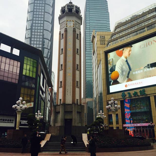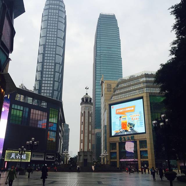 重庆市区去武隆还是有一段距离的,所以我们选择了跟当地的两日团。一大早,就有司机安排接送我们去集合点,集合的地方在解放碑附近,时间还早,我们可以顺便溜达溜达,去超市买了一点干粮,还顺便去解放碑踩了一下点,这里是重庆著名的商业街,很多店铺都没有开门。因为出发时间是八点,所以不敢溜达太久,反正到时我们会回来的。