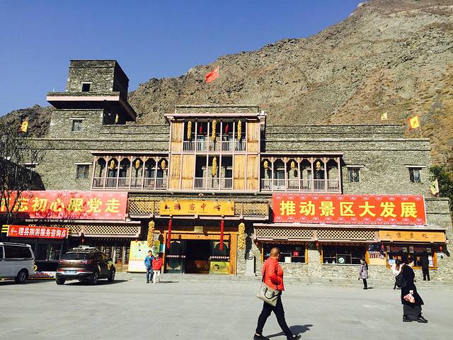 参观完羌族人民的住所,便来到了藏族人的甘堡藏寨,这里比羌寨要大很多,依山而建的建筑物,我们来到的时候,刚好沐浴在阳光里,远处的彩旗飘飘,更添神秘与神圣感。