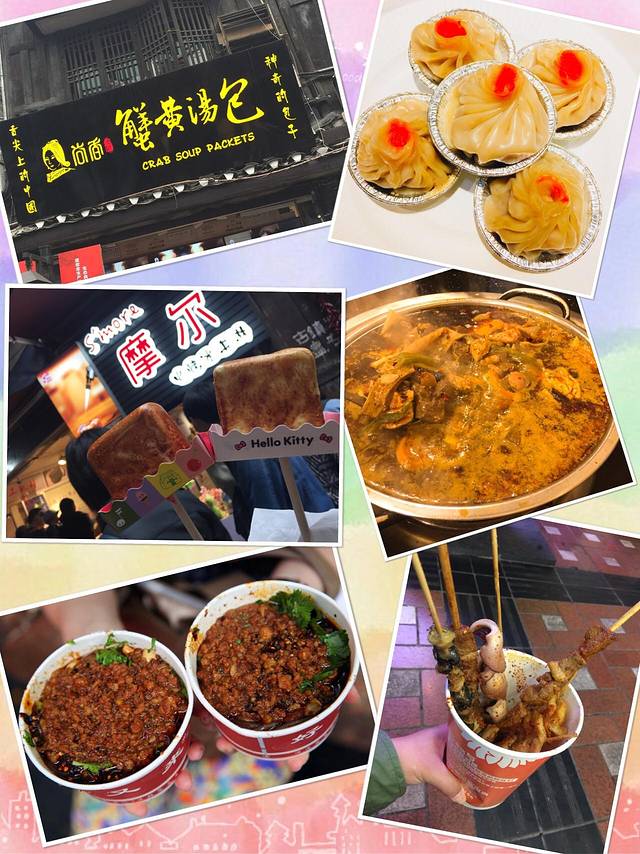 吃的美食实在有点多,不想霸屏赚你们的口水,就直接网罗在一块了,蟹黄汤包我们点的是小笼,有大只的,感觉包了满满的汤汁,需要小心的插进一条吸管,先把汤汁吸走,然后再小心的咬开面皮,吃里面的馅肉。吃了正宗的重庆酸辣粉,果然不一样,它是不带汤的,里面都是肉沫,酸豆角……