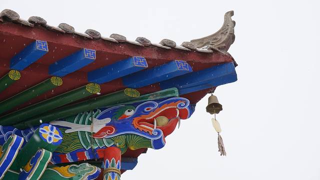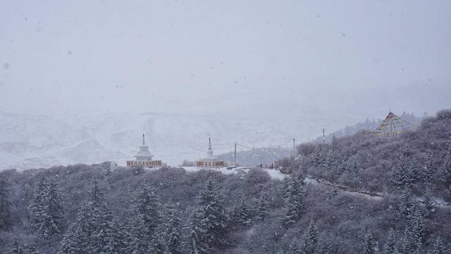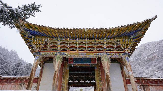 车往马蹄寺方向开的时候,就发现道路在慢慢变白,虽然知道会降温,但是这场雪倒是意料之外的惊喜,雪中的马蹄寺更多了一份圣洁!私家车只能停在半山腰的停车场,不能直接开到山顶,不过我运气还是挺好的,正好遇上了工作人员开车上山,就把我和一对从北京来的情侣一起捎上山了。可能是淡季+下雪的缘故,从我抵达到离开,见到的游客人数只有几十号人。