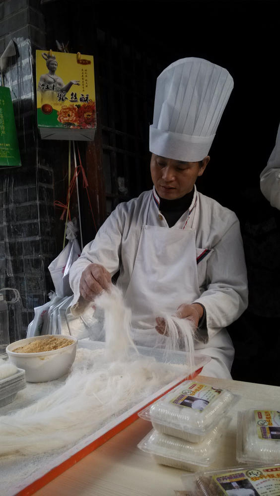 牡丹银丝酥:就是和龙须酥差不多的东东。师傅说他们用的是好的牡丹蜂蜜,可以从一小团蜂蜜拉扯出了六万多根细丝来。路过的人都可以过去让师傅给你包个小的牡丹银丝酥试吃一下。因为我不是特别能吃甜食,所以偶尔吃吃我觉得还是不错,吃多了也腻。