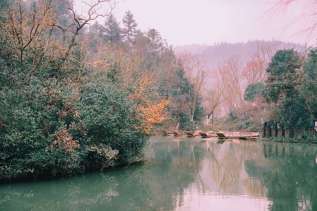 到达桃花源是在周六的清晨,和朋友汇合后,我们便在码头乘坐了游船,游览秦溪。还记得《桃花源记》中这段话吗?"缘溪行,忘路之远近。忽逢桃花林,夹岸数百步,中无杂树,芳草鲜美,落英缤纷,渔人甚异之,复前行,欲穷其林。"没错,书中此处便在秦溪。可以选择乘坐游船,沿着秦溪,一路观看两岸风光。清晨雨后,烟雾缭绕,如人间仙境一般。