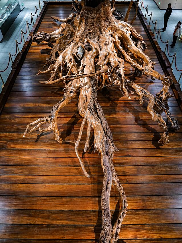 “桃花源”根雕是博物馆的镇宝之作,这是岩柳根雕,根龄达1300多年,加基座重50吨,系国内最大的根雕旷世珍品,实在令人震撼。