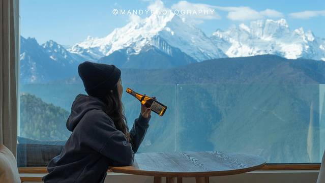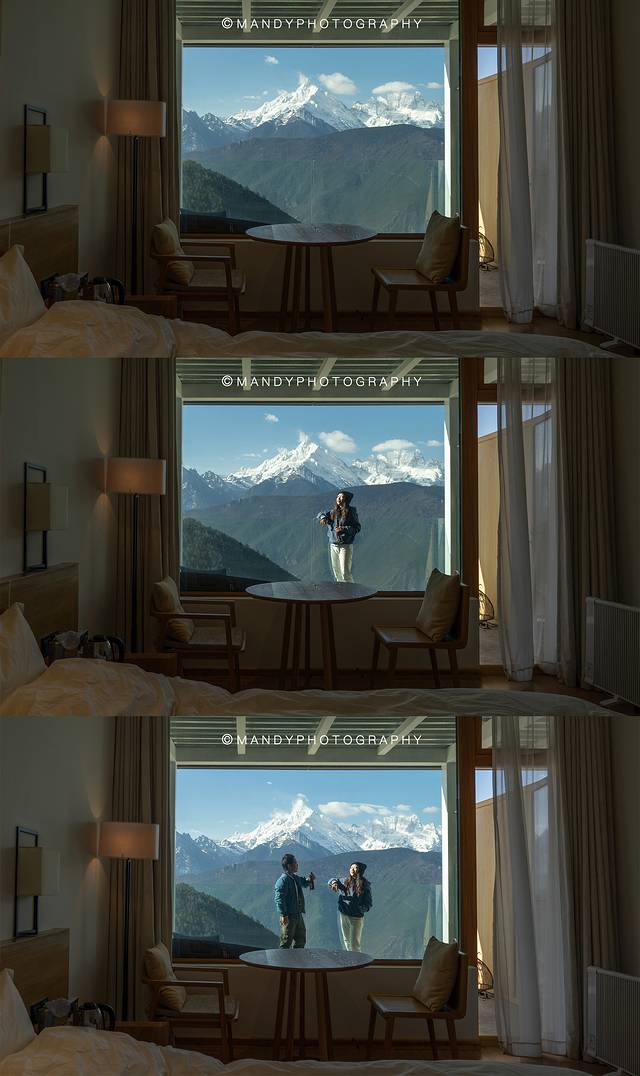 不恰饭也要给它打广告,首先是它的价格仅仅是既下山旺季的1/3,订了三天两晚还不到1000,还不用提前1个月订;其次它的地理位置非常优秀,正对着太子十三峰,躺在房间就能看到日照金山;再者客房的设计也是简约的日式原木风,180度的阳台+玻璃围栏简直就是为观景而设;最后房间有暖气、定时供氧,即便从平原热带地区去的同学也能很好的过渡适应。