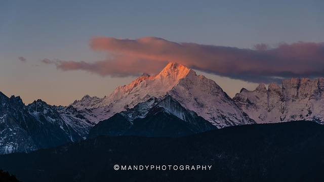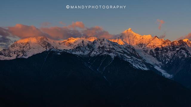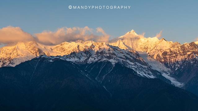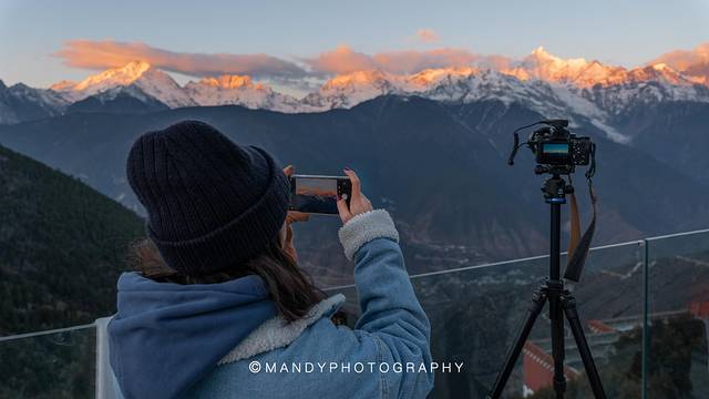第一个清晨,大片的云雾遮挡住了阳光,无法照在梅里雪山的山体上,主峰也被云团围住,Day1的观测宣告失败。到了第二天我们依然充满希望地早起(冬季+西边的日出时间较晚,当天8:11也没有很早啦),虽然不是万里无云、还是有些云团围绕,但卡瓦格博峰的轮廓清晰可见,日照金山壮观的景象就这么出现了10分钟!亲眼看见光线一点点地变化,从山尖一点点的紫红色,到金色,再过渡到日光色照耀全山,内心激动得不行,现场甚至都有人尖叫起来!