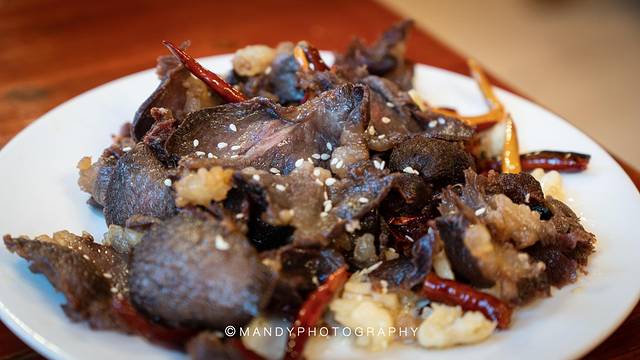 ↓ 牦牛干巴。把风干的牦牛肉片连同辣椒下锅油炸,拌上芝麻,一口一个香啊~~就是肉干稍微硬了点,不然我一个人能吃掉一整盘!