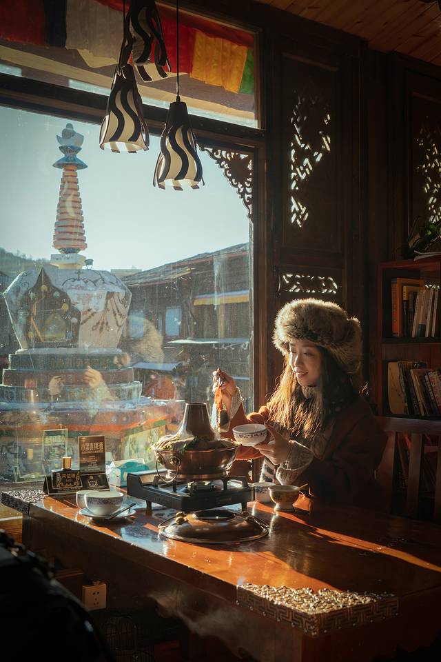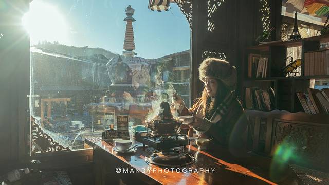 走累了就找一家藏餐厅好好品尝高原美食。5年前来香格里拉,被当地人招待得对藏餐印象非常好,这次来又提高了一个高度!古城里我们吃过两家,第一家是“康巴牧人藏餐吧”,完全是冲着靠窗位拍照好看去的(参考下图),点了牦牛火锅和一些炒土豆和蔬菜,火锅料还蛮足,我觉得还不错但男票不爱吃;炒菜对于最爱盐水白焯的广东人来说是巨咸…第二家“宗喀藏餐”要给好评!炒菜每个都超乎预期,会留在最后细说。