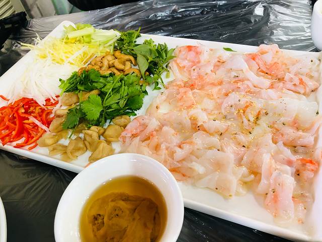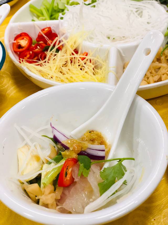 每种配菜夹一点 再放上花生+和黄豆油拌匀一口吃进去 ,黄豆油里面还放了姜末应该是为了祛寒吧。吃起来有吃炸酱面的感觉,一口下去,口感很丰富,既脆又有鱼生的滑口,很解腻。个人感觉比在顺德吃到的鱼生更好吃😋虽然配料和切出来的薄片都很相似,但配上黄豆油又是不同的味道
