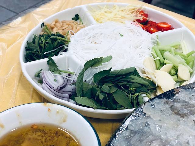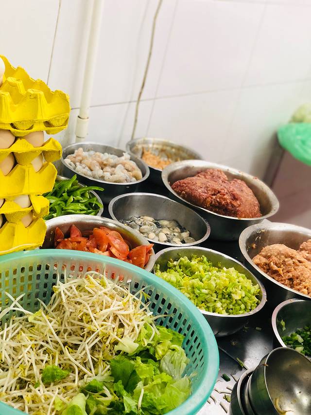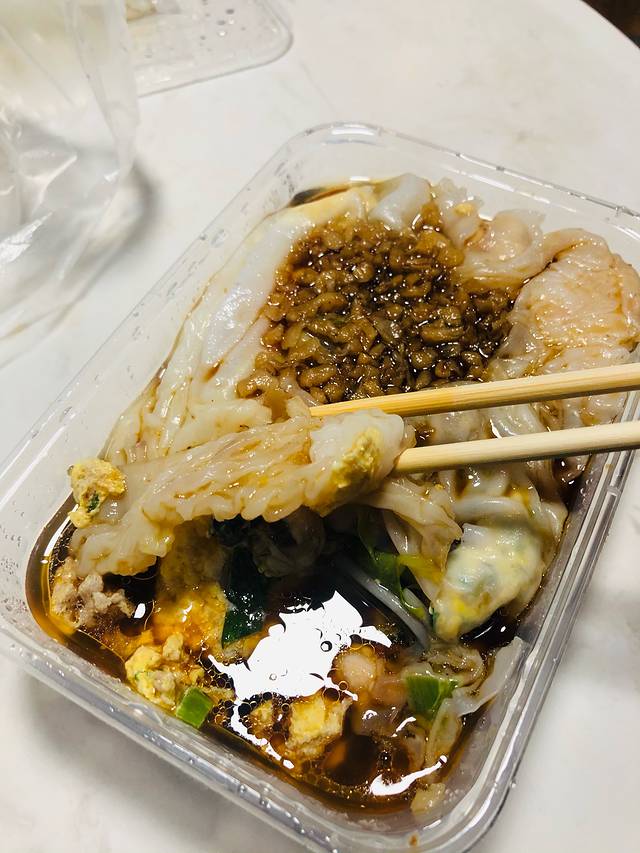 点了全家福肠粉。牛肉,猪肉鸡蛋,海鲜(虾🦐,生蚝🦪),鸡肉,豆芽菜,青椒,西红柿,生菜,全包含在内了。皮特别薄,馅儿料丰富👍
