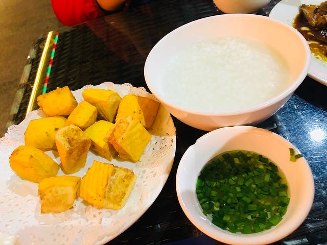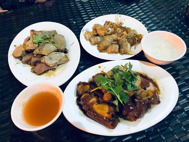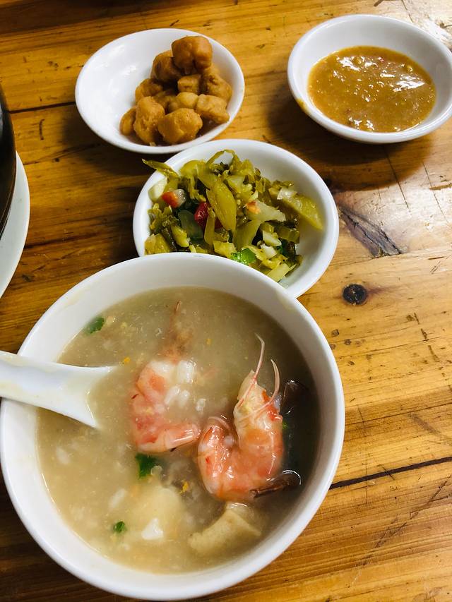 虾特别多,吃起来鲜甜,可以吃出是特别新鲜的食材,喝粥还会送配菜有酸菜和油炸果还有黄色的豆酱。不知道是不是普宁豆酱哈哈哈,可能是配粥喝的吧。油炸果老板说可以直接吃,个人感觉泡在粥里更好吃嘻嘻