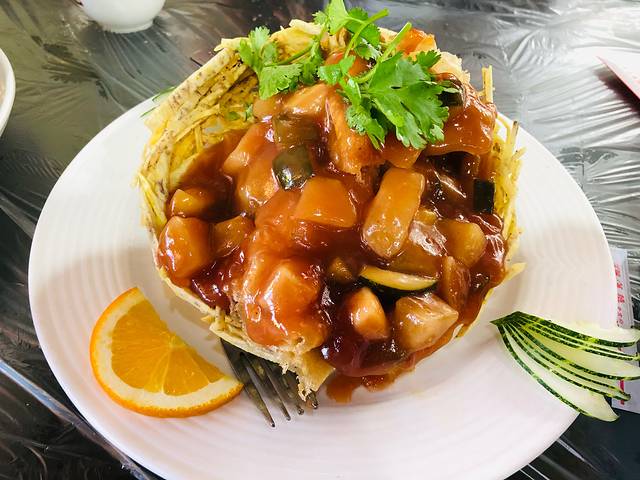 雀巢筑顶,外皮是炸的类似春卷皮,里面包的去皮绿豆。 裹的酸甜酱个人感觉淀粉多了些,过稠。下面是炸芋头条。