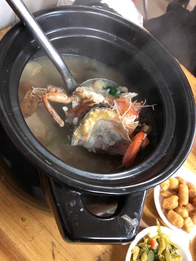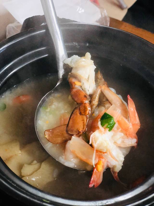 虾蟹粥 我们这暴看起来很大,不知道是中煲还是大煲,里面有整只螃蟹🦀️和特别多的虾🦐还有干贝鲜贝,还有一个类似鱼豆腐切成片的,不知道是是不是豆腐,反正料特别特别的足