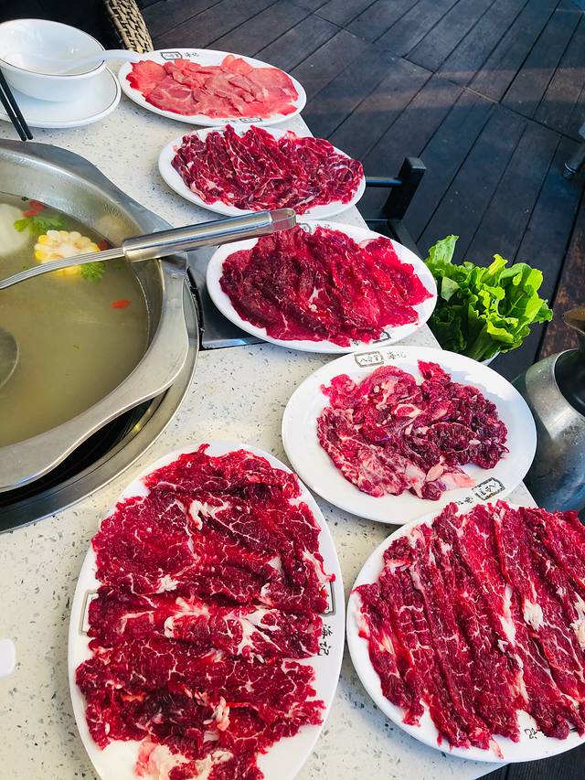 杏花吴记家,都是牛骨汤锅底,每桌都会送一份儿生菜🥬。最开始点了胸口油,生牛肉丸,吊龙,匙柄,雪花肉和五花趾~ ~