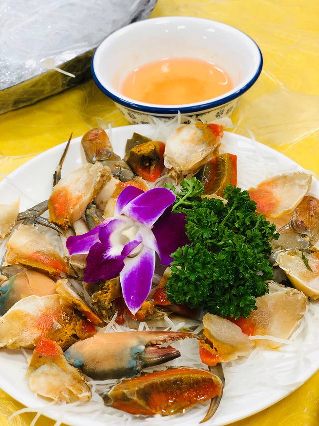 潮州咸膏蟹 红色的蘸料是醋,膏蟹感觉是冰冻过的,吃起来像吃沙冰,但是黄色的部分稍微有点腥味 个人不太吃的惯,配上醋会好些