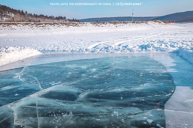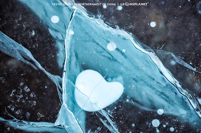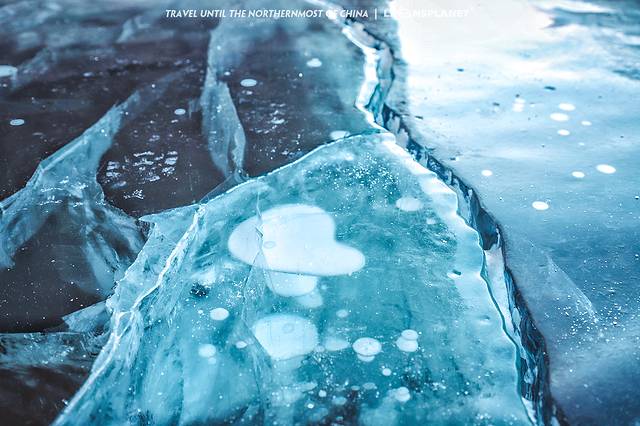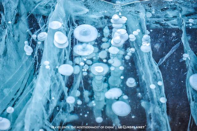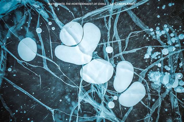 观音山的神奇之处在于山脚下有一片盛产冰泡的湖泊,漠河冬天的极寒天气让封冻的湖水里冒出一大串凝固的水泡,像风格派画师握住了自然之笔,绘就了如此匠心独具的作品,真的感叹造物主的鬼斧神工。