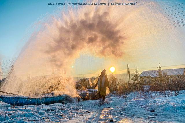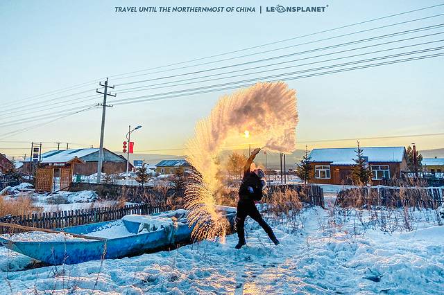双腿弓步站定,大臂带动小臂,手腕压着保温瓶的出水量,全程匀速抡圆胳膊,只见滚烫的开水冲出瓶口,冒着腾腾的热汽,在极寒的气温下急速凝结,刹那间飞雪四溅,像千万支细长的箭矢射向天空,在晨光映衬下,展开成一把镀上 金边 的巨大羽扇,远观犹如罕见的白孔雀开屏,煞是美幻。