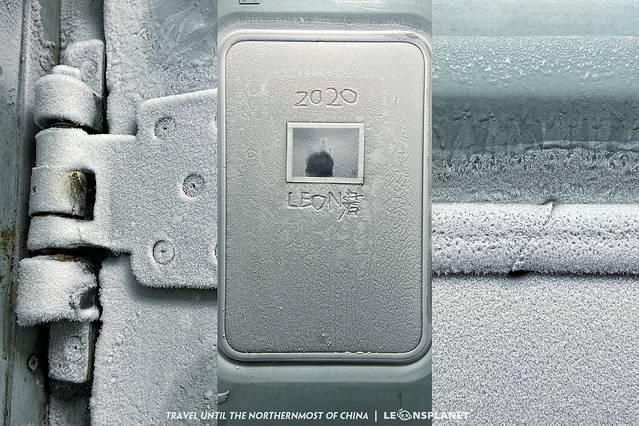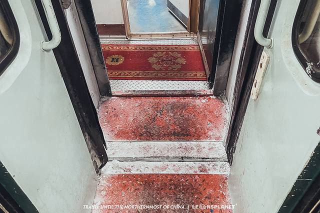 然而更令我吃惊的是,连接处的地面上结着一层莹白的雪沫,对外的铁门布满了毛绒绒的雪挂,窗沿、门把手无一例外的都爬满了白霜,就好像我推开的不是车厢门,而是冰箱门一样,我被眼前的奇景怔住了……我从未见过如此酷炫的绿皮火车,直接翻拍《雪国列车》的话,后期特效都能省掉了。