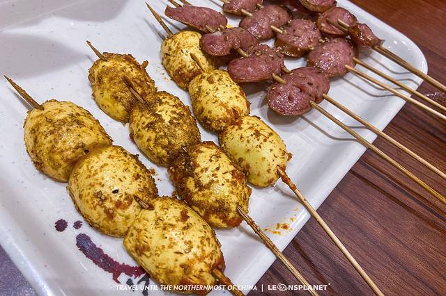 所以,为了留肚子吃正餐,我们都不太敢去碰饺子和粥,因为烧烤的分量也很大啊,尤其是招牌炸蛋,以为是类似 台湾 那种烤鸟蛋,结果上来一串三个,每个都跟鸭蛋那么大,一人一串都吃不下……嗐,我们还是太天真。