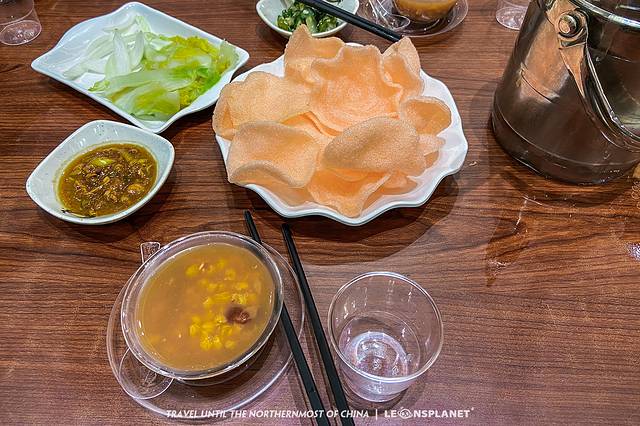 我们就座以后,菜还没点齐,服务员就唰唰端上来免费的餐前小食——虾片、泡菜、酸黄瓜啥的倒也挺正常,海底捞也这么干……但是,后面竟然还送来了热气腾腾的饺子和玉米粥,我就有点不淡定了,这赠品也太实诚了吧,感觉啥也不点就能吃饱喽。