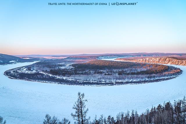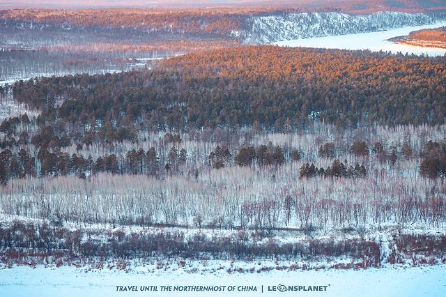 绵延数千公里的 黑龙江 ,在这个地方连续转了两个U型湾,两湾之间形成一个江水环抱的半岛——金环岛(俄罗斯领土)。据说夏天的时候绿树成荫、花草繁盛,但冬天树林色彩尽褪,远看如篝火燃灭的灰烬铺在雪地上。