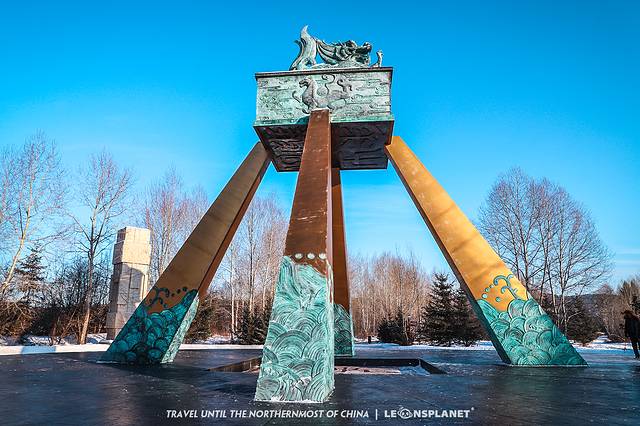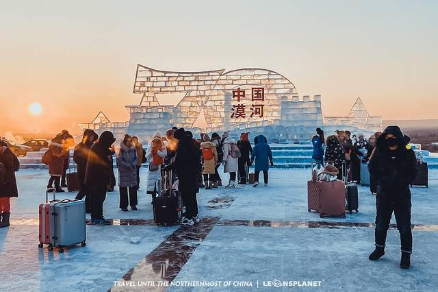 我们一行人从金鸡之冠启程,一路徒步穿越江堤、林地、灌木丛,途径各种石雕、雪雕、文创摆件、游乐设施,最后踏着夕阳的余晖到达神州北极广场。