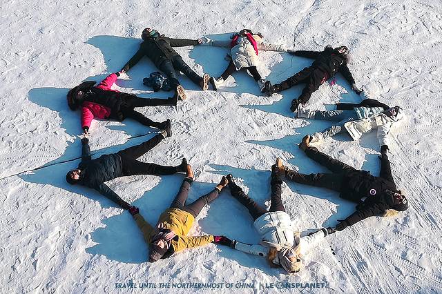 大强哥旅拍首站带我们来到了冰冻的额木尔河,河面上是六三大桥,他强烈呼吁我们躺在冰面上围成一个圈(包车团组了几个新的小伙伴),打开四肢,手脚相抵,组成一个人形的九芒星。