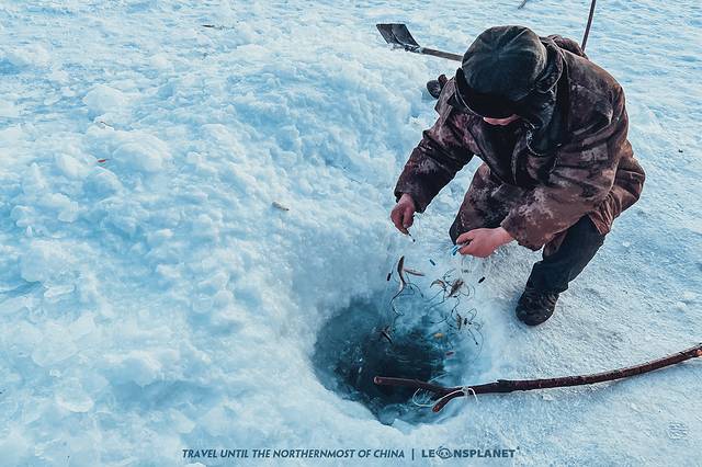 要说这民间演出还真的是迷你,用一把铁锹凿出一个脸盆大小的冰窟窿,然后用渔网拽出几条还没手指长的小银鱼,给你看一秒钟然后赶紧放回水里,不然小银鱼就变成小冰棍了。