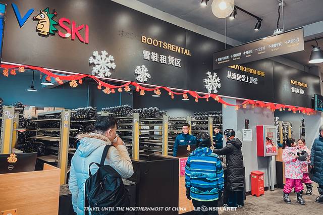 换好一整套滑雪行头之后,就可以领取雪杖和雪板入场了。