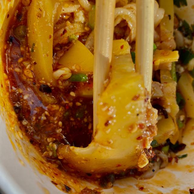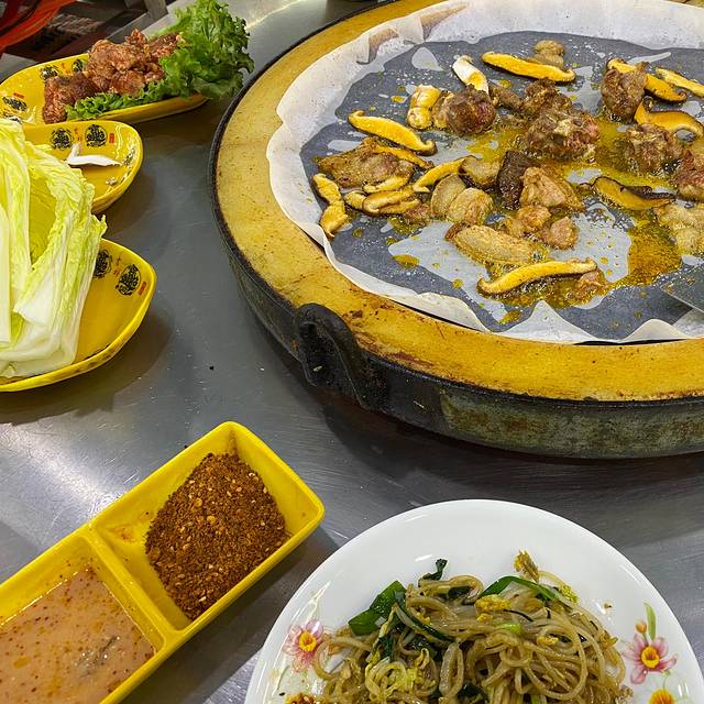 铁板烧热,放上一份猪五花,滋啦冒油,鲜香四溢;配上一份蘸水再加一份炒米线,夜宵的快乐足够了。