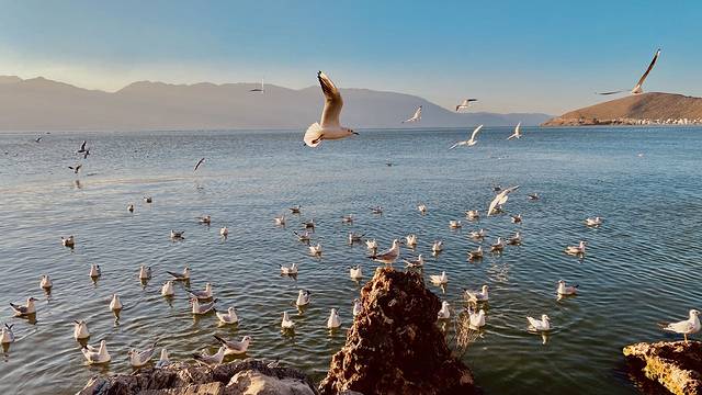 观音阁,海印岛,小普陀,看成群的海鸥(11-3月)在空中飞翔,又落于水中,买上一包饲料,轻轻投喂,看漫天的海鸥在你身边盘旋。