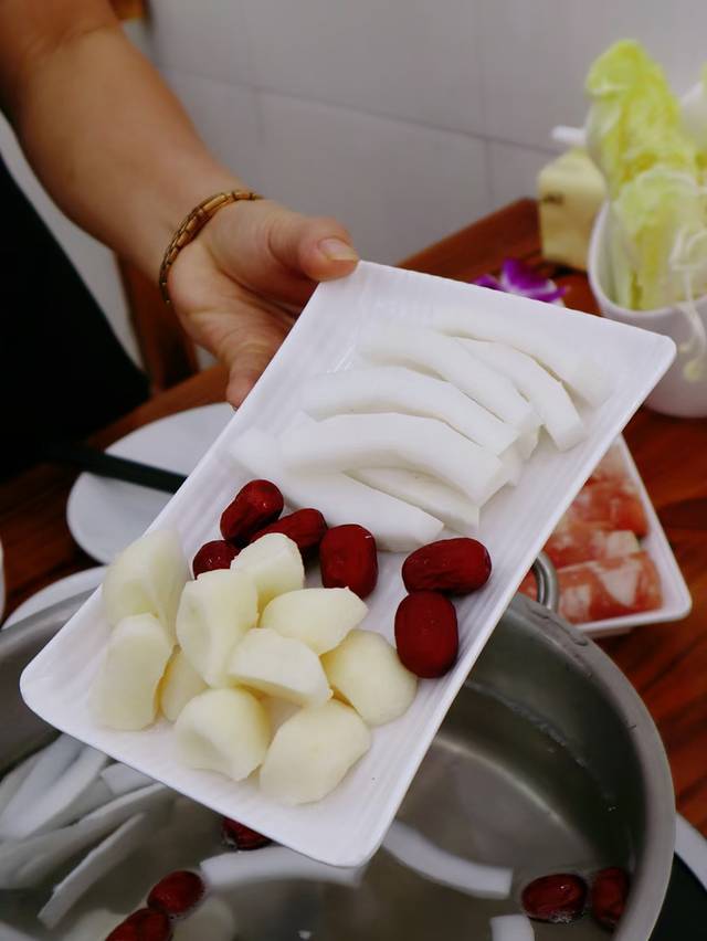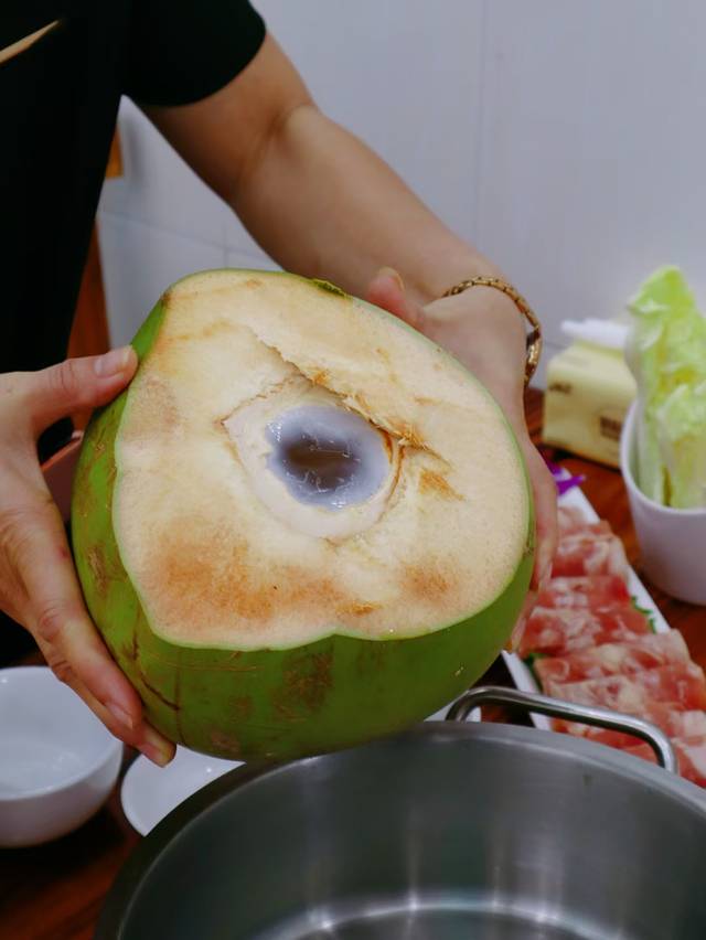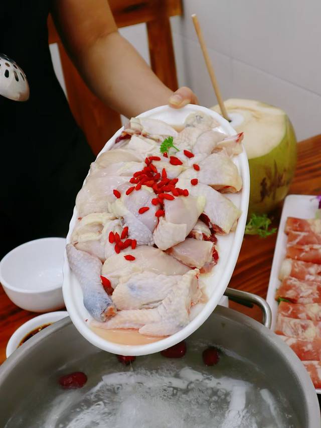 爱他家原因,配料太实诚喽,马蹄椰肉红枣满满一大盘。也是一锅汤鲜美的㊙️绝,还有现砍三个新鲜椰子,对了这家不加水,完全就是椰子本身👏煮开后下入海南本土散养椰子鸡,三分钟后,空气中弥漫香甜幸福味道,入口鲜嫩好吃的椰子鸡好吃停不下来。