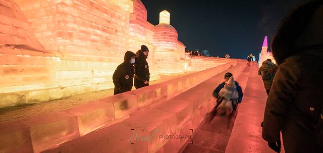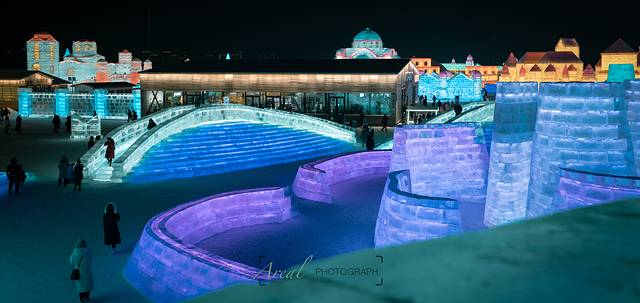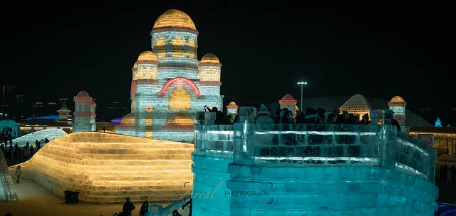 我虽是北方人,但没有 东北 这么北,即便冬季只有冻的份儿,没有玩的乐儿。这次可算是大开眼界乐。不但观赏到各种风格的大型冰雕建筑艺术品,还有众多冰上游玩项目。脚下是冰、手触摸冰、目光所及之处全是冰,彩色的灯光穿透晶莹的冰块,让建筑呈现出更多的立体层次。也不过十几天的时间,从平地变乐园,这是多么庞大的工程量与惊人的速度。
