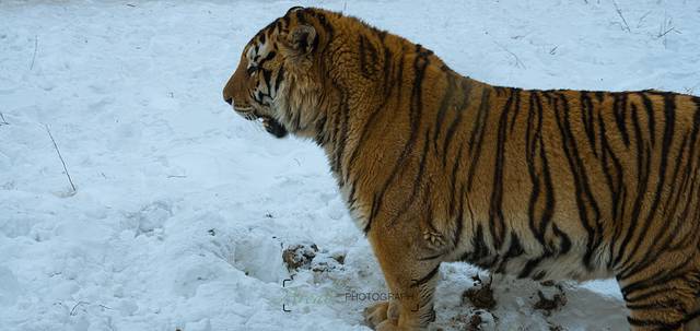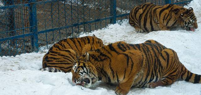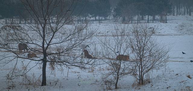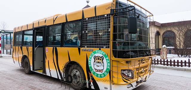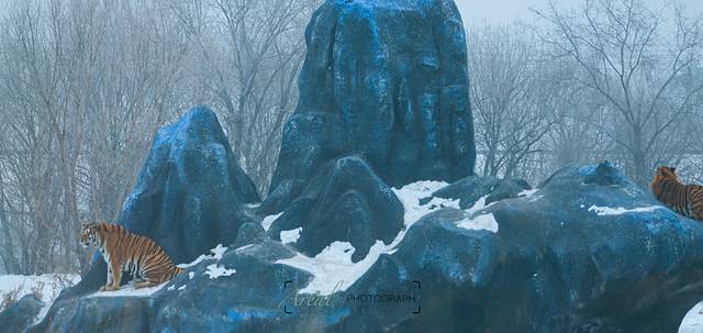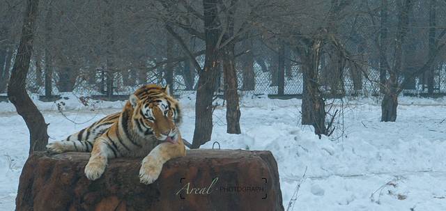 当地老炮儿告诉我们,其他地方是人看老虎,在这里是老虎看人。果然,乘坐旅游游览车一进入到园区就能看到远近的雪地上、假山上,老虎们悠然自得地卧着,数量远超一车人数。