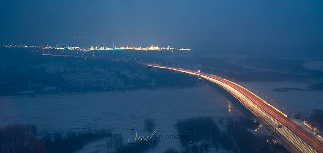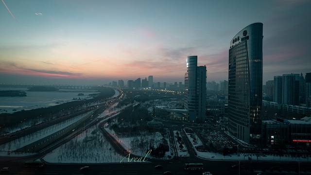 夜晚透过窗,穿越至车水马龙的跨江大桥,不远处灯光缤纷的冰雪大世界像是一个五彩的聚宝盆。
