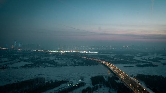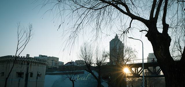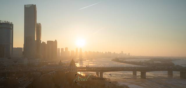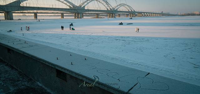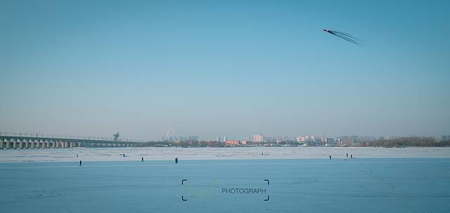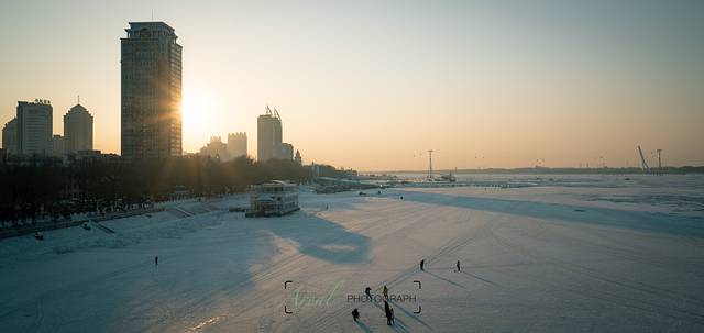 洁白的松花江面有天鹅绒般的质感,夕阳恍惚间已与白昼暧昧不明,冷色调暖色调失去界限,成为了松花江温柔的背景。