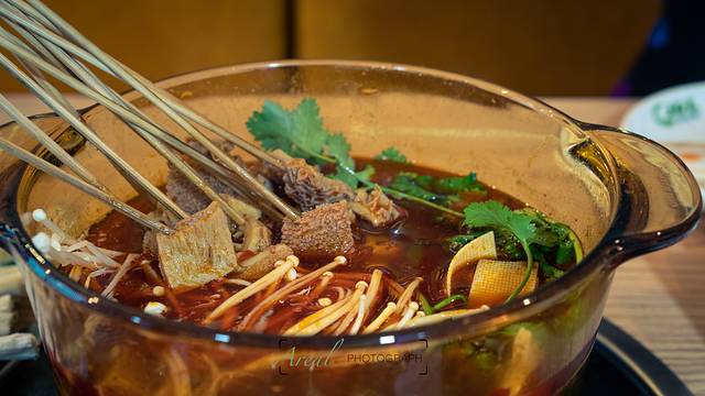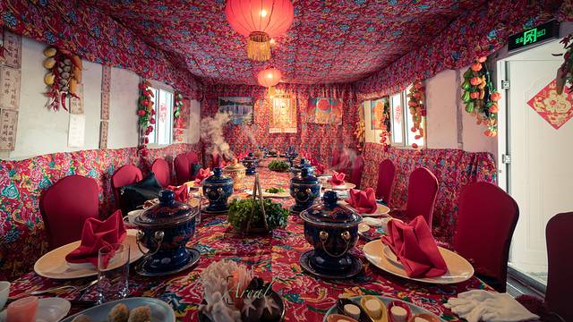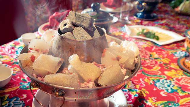 酒杯是用冰做成的,就连碳炉里的锅底也是冰,用冰块锅底来煮羊肉叫做冰煮羊,这样的特色不到 东北 吃,不带感。不得不说,羔羊肉鲜嫩可口,丝毫没有腥膻,就连以往很抗拒羊肉的小伙伴在尝试后都吃的停不了口。不能停下来还有一个原因——冷,不要被大花布的假象欺骗,此刻可是坐在零下20度的冰天雪地里吃火锅呢。