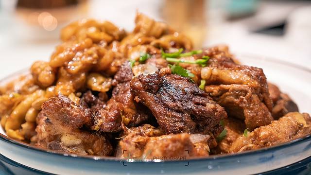 端上桌时与炖大排放在一个盘子,我先尝一筷朋友“求”来的豆角,立马两眼冒光,普通豆角皮薄,久炖易烂,这豆角皮厚且软糯,豆子同时吸收了汤汁精华,十分入味,香味馥郁。