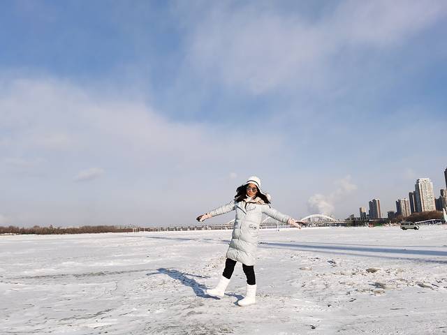 松花江,防洪纪念塔,不用门票,就是在中央大街门口走到尽头,再过个地下通道就到了,到那里感受江水冰封后踩在上面的感觉,再去走走松花江大桥,也是网红桥,江面风大刮得很疼。松花江晚上有个冰雪嘉年华,就是各种冰雪娱乐项目,之前在景点基本都玩过了,所以就随便走走,如果没玩过的可以来这里看看,项目没有大秃顶的贵。