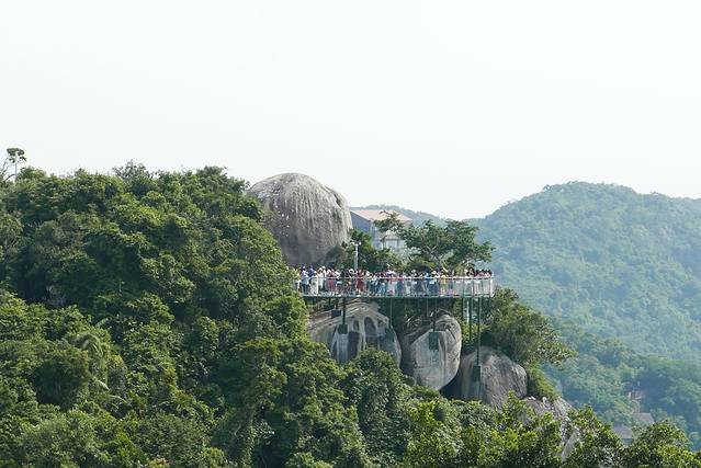 晌午刚到,便迫不及待的开始了我们的吃鸡大战!文昌鸡色泽淡黄光亮,皮脆肉嫩,味鲜骨酥,蘸上特制的海南酱料,香味四溢,肥而不腻,十分爽滑可口!吃饱喝足之后,文昌旅行第三站,铜鼓岭,三面环海,地貌奇特,大家坐着电动车上了顶峰,在那我们能看到最美的月亮湾。俯览整个山岭,月亮湾海浪翻涌千层,海天一色空朦,在这你会感受到人类的渺小,放空自己,放下无尽的烦恼和疲惫。