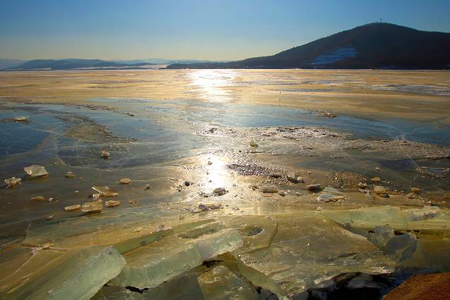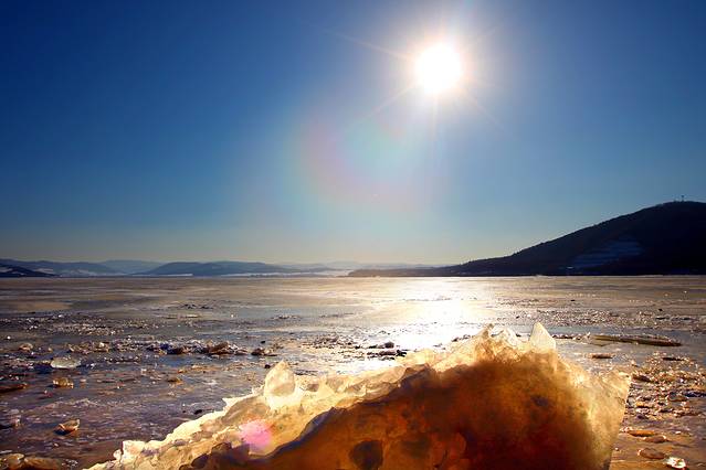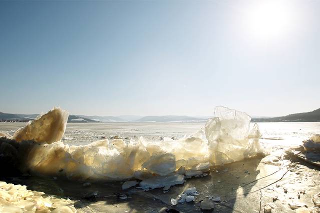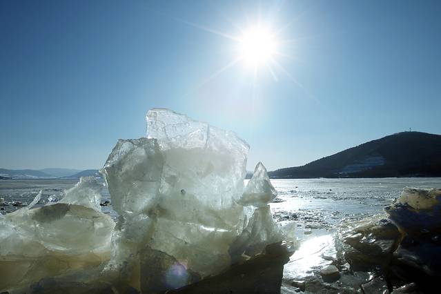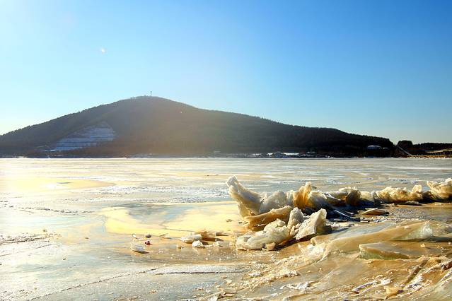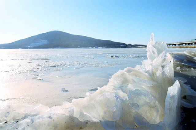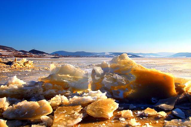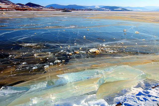 在各种外力的作用下,冰层破裂并被逼向岸边,形成各种形状,很是壮观。