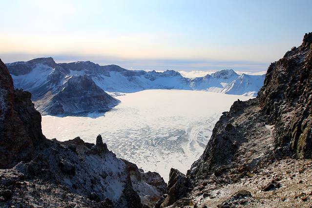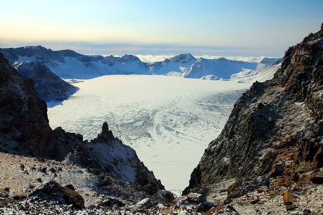 天池位于长白山主峰火山锥体的顶部,是一座火山口,经过漫长的年代积水成湖。