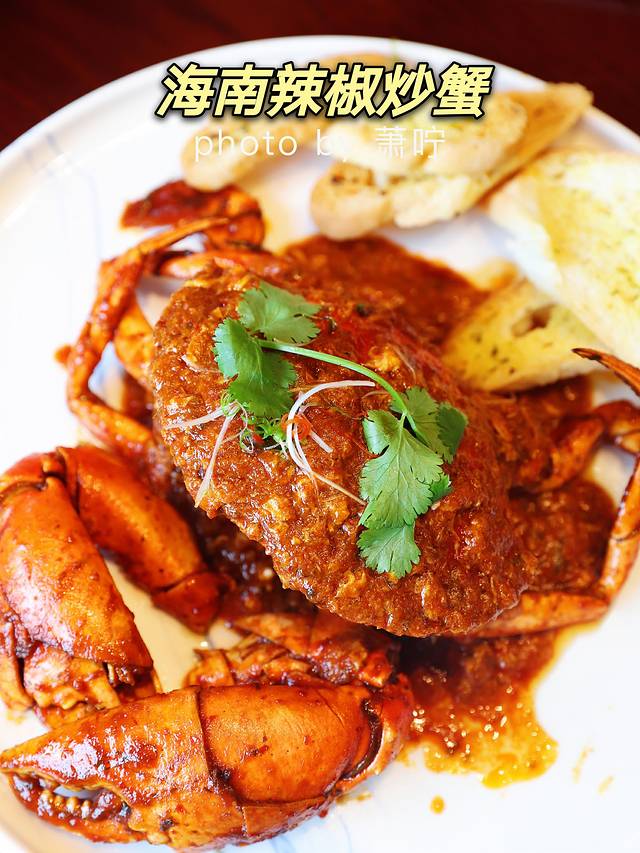 锵锵蟹,主打4种口味的螃蟹,我们点了海南辣椒炒蟹,海南的辣椒都不怎么辣,咸甜适中,比较适合不能吃辣的宝宝。螃蟹很大一只,非常结实,蟹肉很足。搭配面包片沾着蟹的酱汁吃,还挺好吃的。酱汁不要浪费喔,淋在米饭上,也是相当好吃呢~