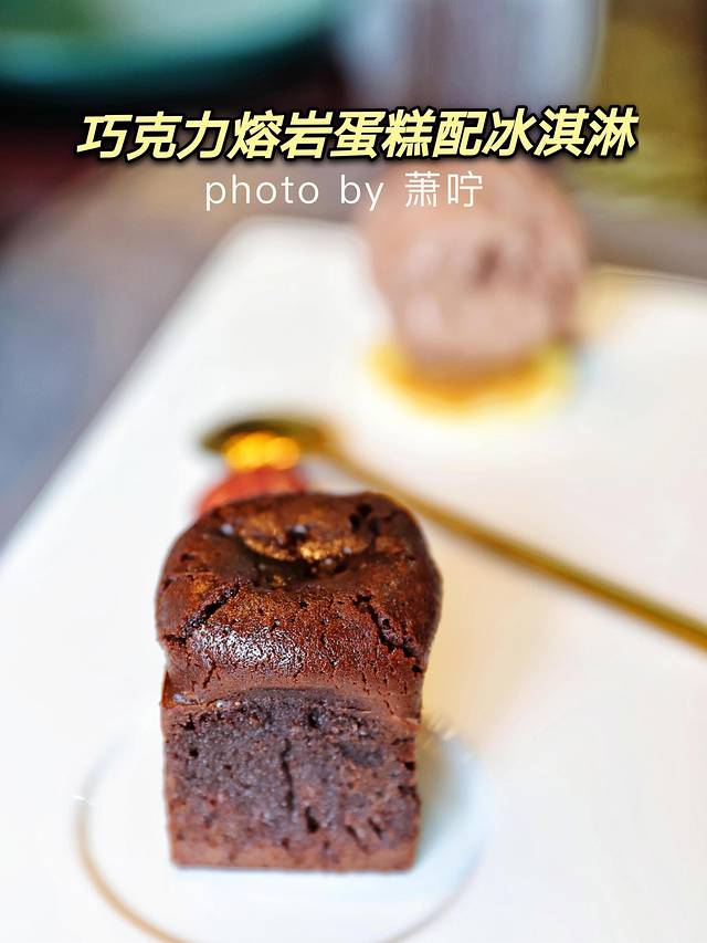 餐后甜点【巧克力熔岩蛋糕】现烤的味道简直不要太好,温热的熔岩蛋糕搭配冰凉爽口的冰淇淋,冰火两重天的口感,真的好爱啊!即使前面已经吃得很撑了,我还是把熔岩蛋糕和冰淇淋全部解决了,心满意足~
